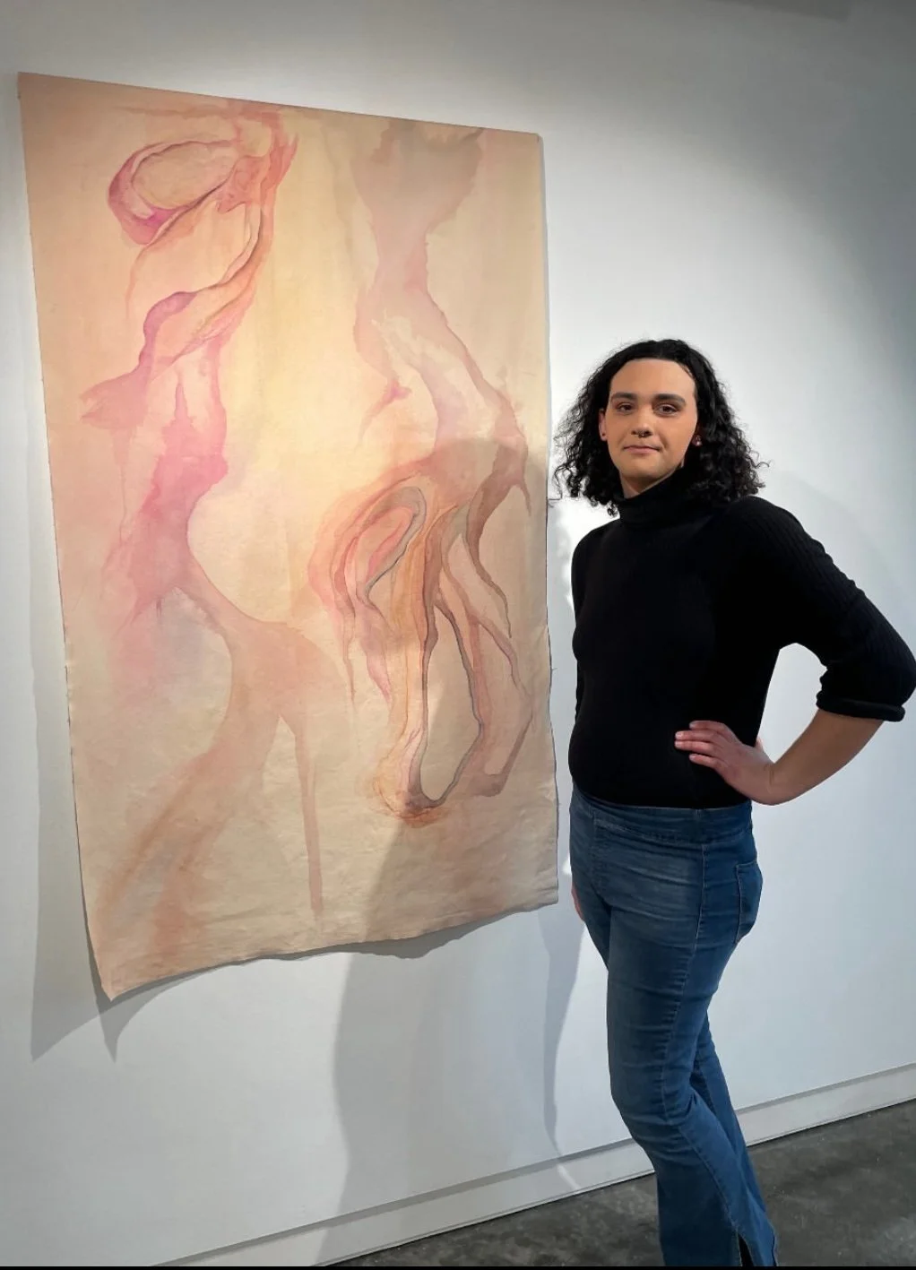 Michelle Eisen is an Akron-based Zambian-American trans-media artist working across the boundaries of printmaking, painting, and installation. She holds a Bachelors of Science in Visual Communication Design from West Liberty University, and a Masters of Fine Art from Kent State University. Her work explores the immeasurable sensitivities of print media and how they connect to her personal experiences with queer relationality and the feminine. Her practice reframes the notions of contact and pressure in print media towards a feminized philosophy of printmaking and the printed mark as transactional and sensual. Through her use of watercolor monotype and stuffed canvas forms, her work reinvents the bounds of the figure to better suit her own experiences as a queer trans woman. Her work has been exhibited in Ohio, West Virginia, Pennsylvania, and Florida.